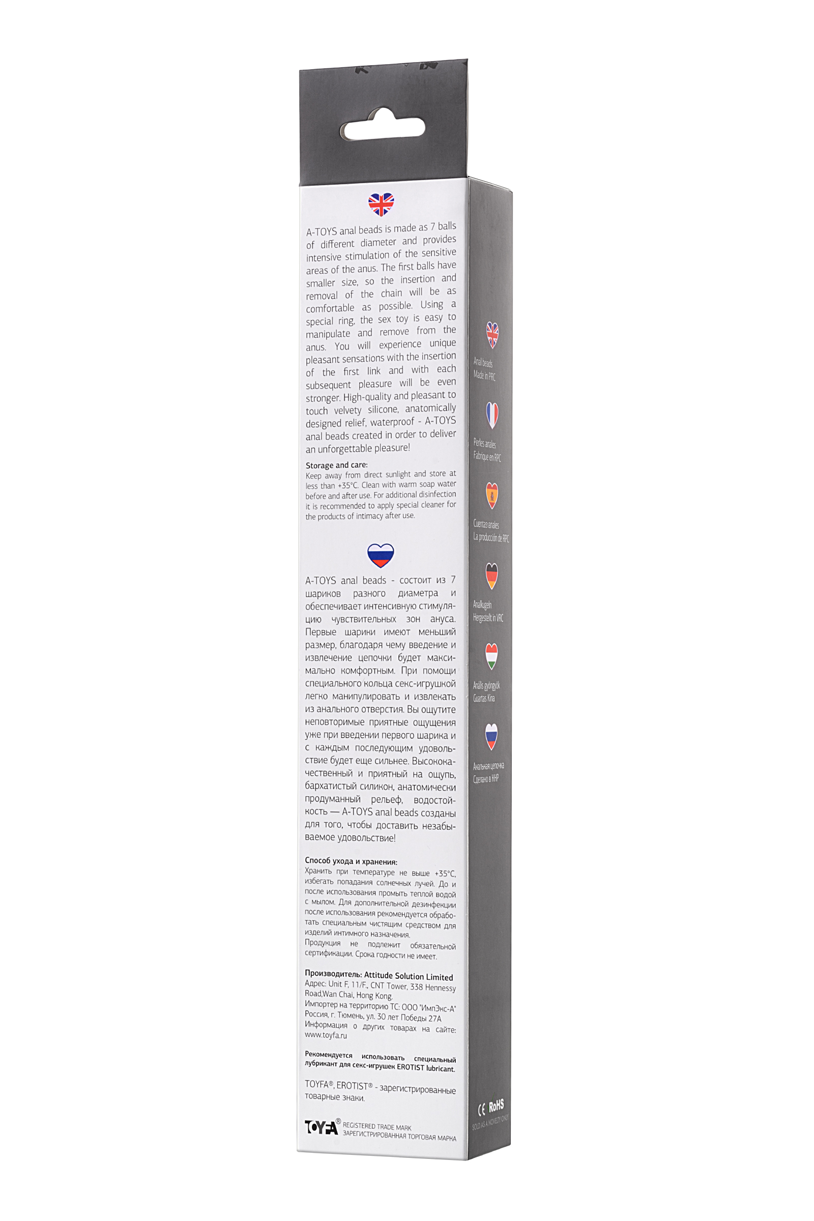 Тойфа А-Тойс anal beads - состоит из 7 шариков разного диаметра и обеспечивает интенсивную стимуляцию чувствительных зон ануса. Первые шарики имеют меньший размер, благодаря чему введение и извлечение цепочки будет максимально комфортным. При помощи специального кольца секс-игрушкой легко манипулировать и извлекать из анального отверстия. Вы ощутите неповторимые приятные ощущения уже при введении первого звена и с каждым последующим удовольствие будет еще сильнее. Высококачественный и приятный на ощупь, бархатистый силикон, анатомически продуманный рельеф, водостойкость — A-TOYS anal beads создан для того, чтобы доставить незабываемое удовольствие!Рекомендуем использовать до и после применения - дезинфицирующее средство для игрушки, чтобы обеспечить длительное скольжение и комфорт интимных отношений, рекомендуем использовать анальную смазку на водной основе. Хранить при температуре не выше 35 градусов, избегать попадания прямых солнечных лучей. Перед хранением необходимо хорошо просушить